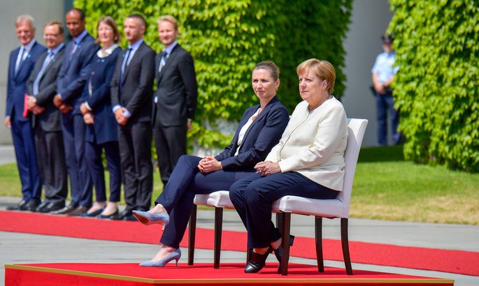 In break with usual protocol, #Germany Chancellor Merkel receives #Denmark Prime Minister Frederiksen at the Chancellery in Berlin for military honors with both seated. pic.twitter.com/MyaxqJc36Y