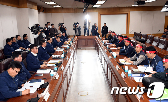 | 서울지하철 1∼8호선을 담당하는 서울교통공사 노사 관계자들이 막판 협상을 위해 15일 오후 서울 성동구 서울교통공사 본사 협상장에 마주 앉아 있다. 2019.10.15/뉴스1 © News1 이광호 기자 |