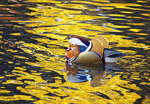黄金に輝く水辺を泳ぐカラフルな水鳥―。鏡石町の常松道男さん(72)=鏡石町=は11月中旬、須賀川市にある公園の池で、美しいオシドリの写真を撮影した。